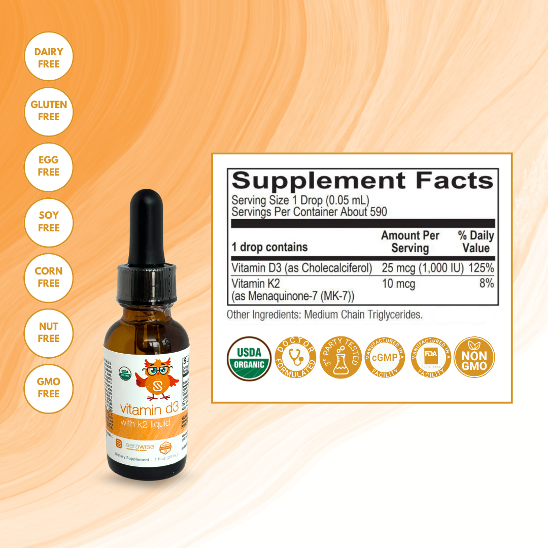 Vitamin D is well-known to activate genes that regulate the immune system. It has been shown that children with lower levels of vitamin D are more at risk for viral illness, mental health issues, and allergic diseases like eczema, asthma, and seasonal allergies. Vitamin D increases the anti-inflammatory and antiviral responses of the cells that line the respiratory system during respiratory viral infections. I selected this formulation in fat and with Vitamin K for better absorption