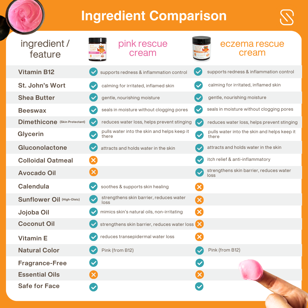 • Many families use Pink Rescue during flares and Eczema Rescue Cream for thicker, drier patches.